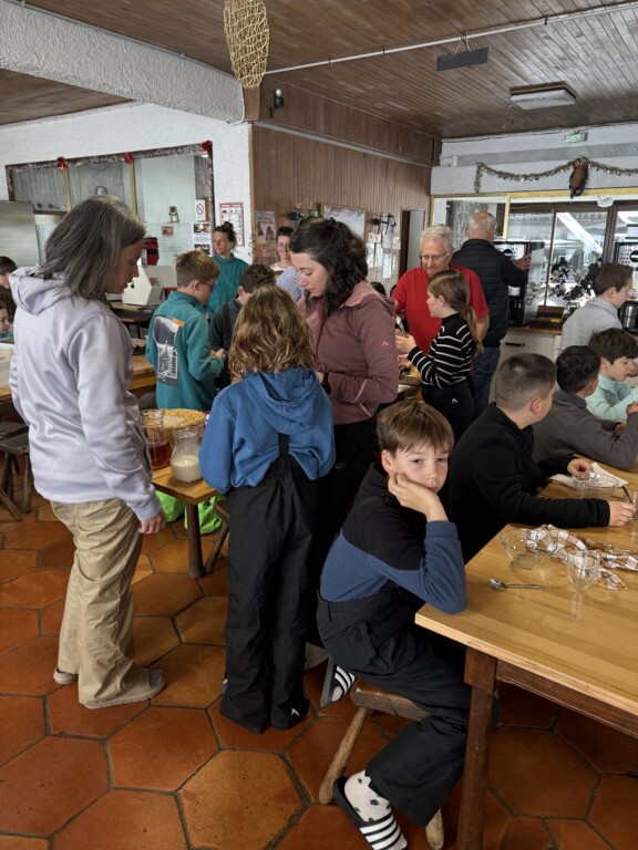 Le petit déjeuner vite avalé, nous avons rejoint les moniteurs au pied des pistes pour le troisième cours de ski. Les conditions climatiques sont suffisantes pour que chacun puisse continuer ses progrès, perfectionner l’utilisation du tire-fesses ou l’arrivée du télésiège ! Bien-sûr, quelques chutes rappellent à certains la fraîcheur de la neige, mais dans l’ensemble celles-ci ont été rares, signe du niveau atteint par nos champions. Les skieurs avertis partent de nouveau tester d’autres pistes (bleues, rouges…) avec leurs moniteurs.